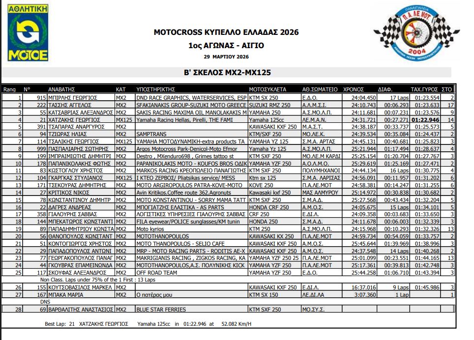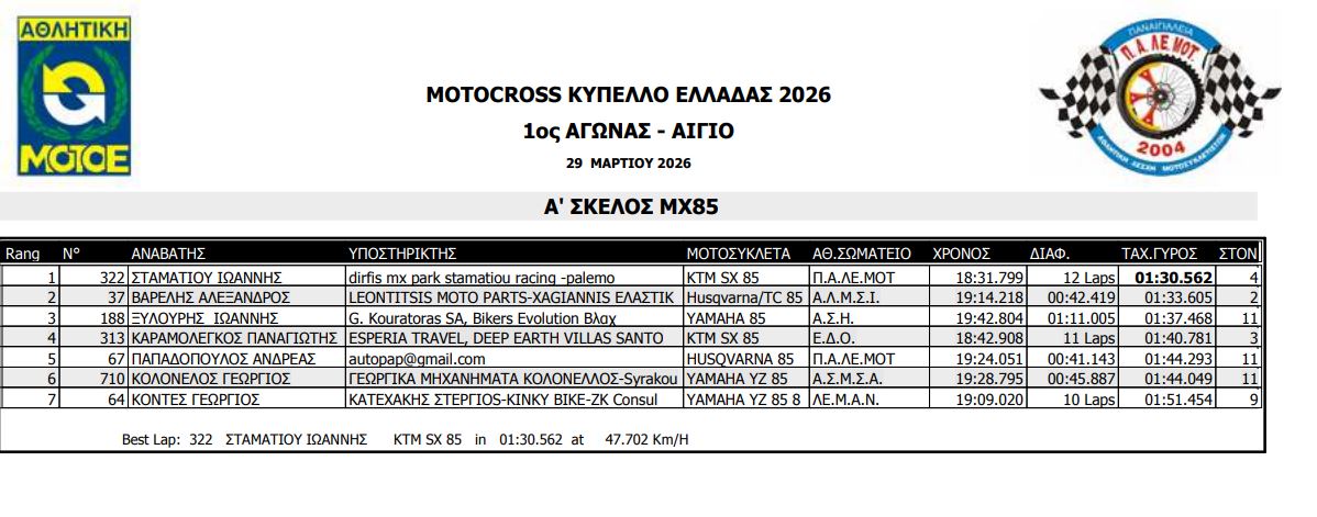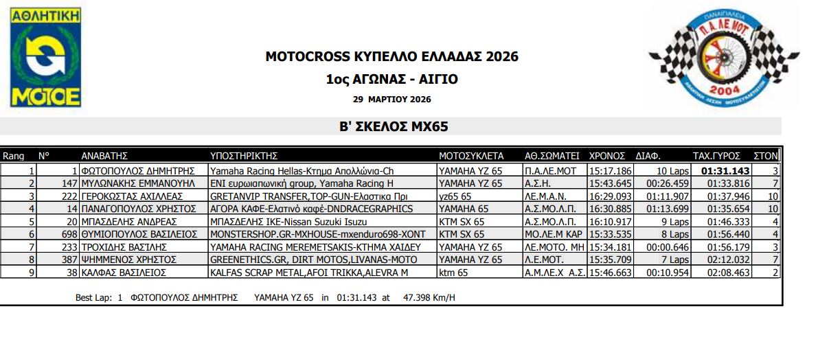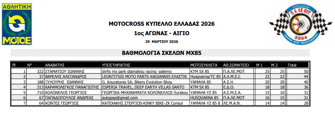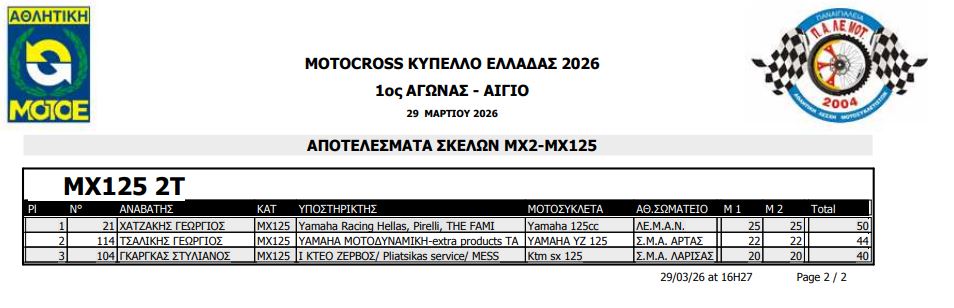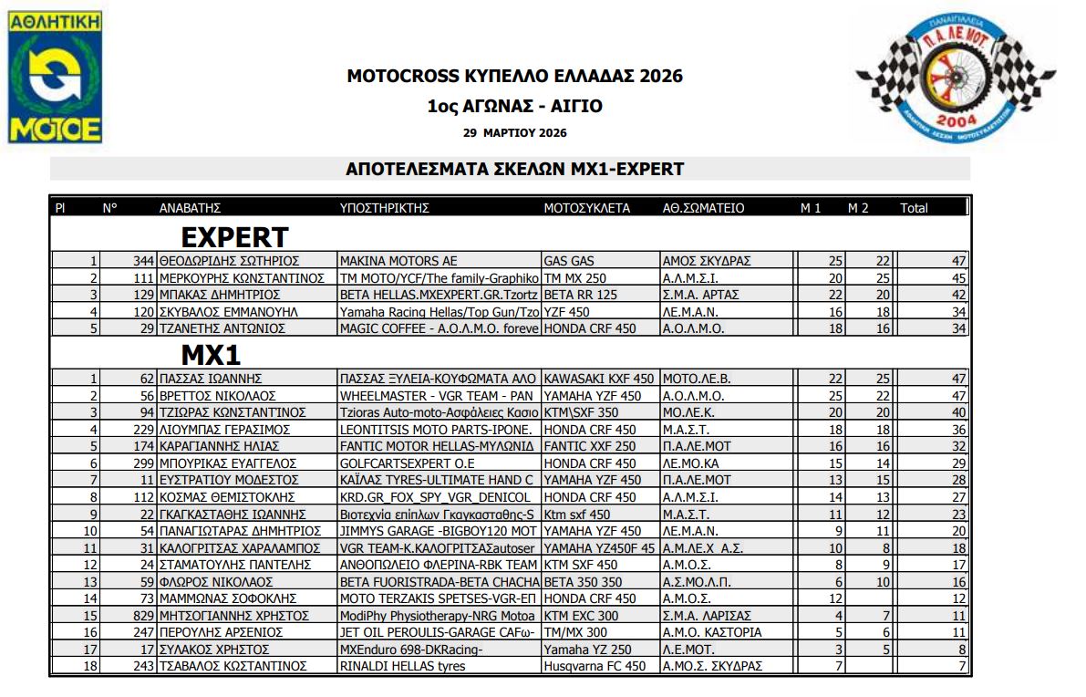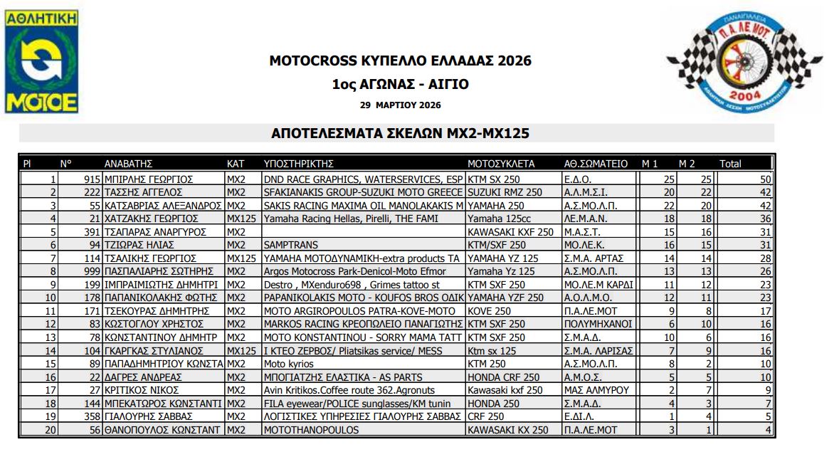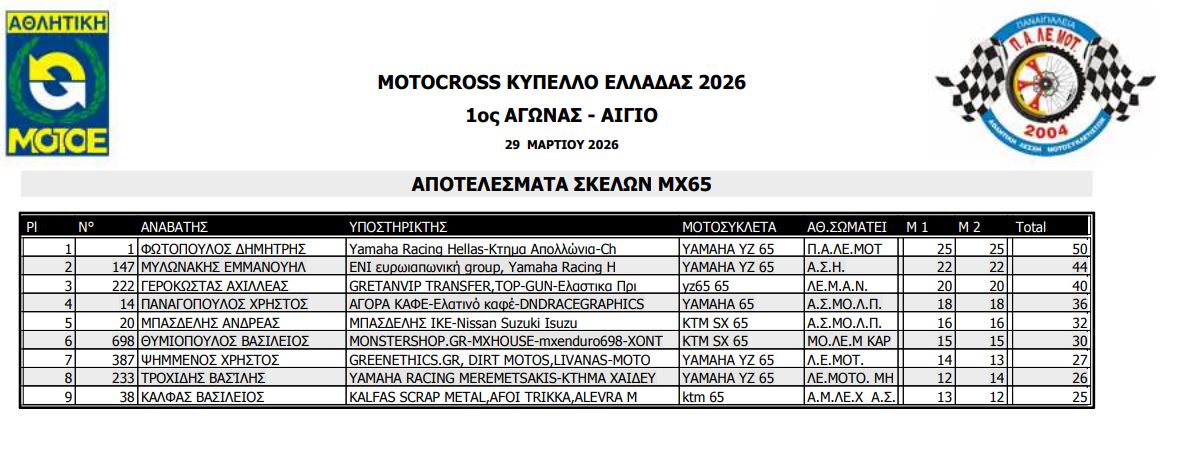 ΑΠΟΤΕΛΕΣΜΑΤΑ ΠΡΩΤΟΥ ΑΓΩΝΑ ΚΥΠΕΛΛΟΥ ΕΛΛΑΔΟΣ MOTOCROSS 2026 ΑΙΓΙΟ