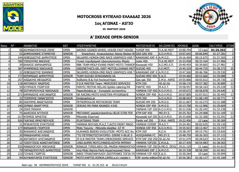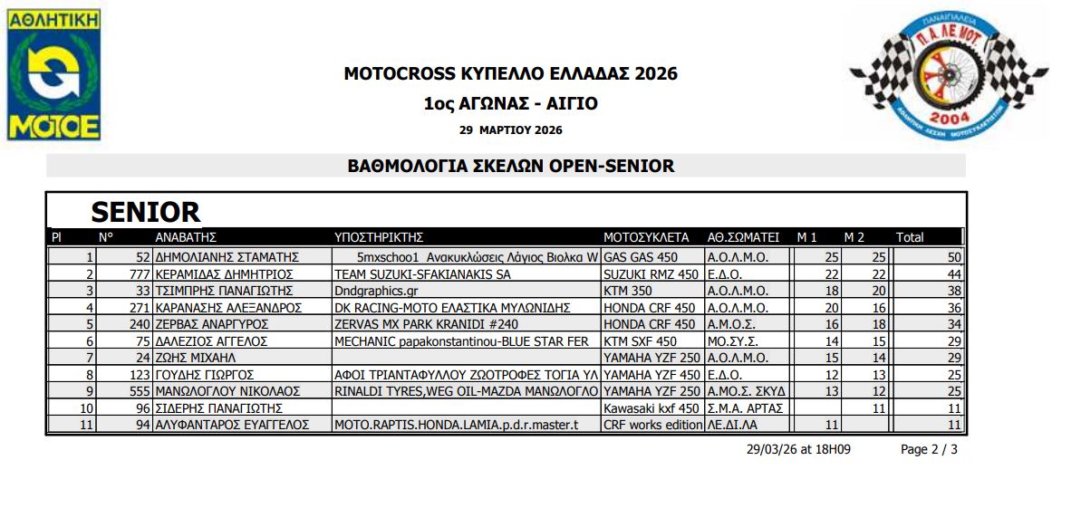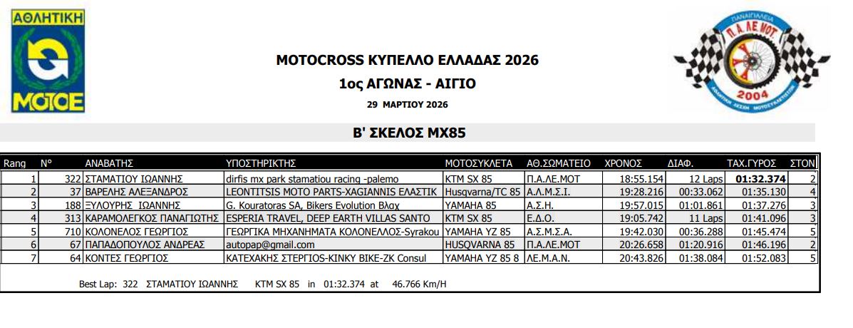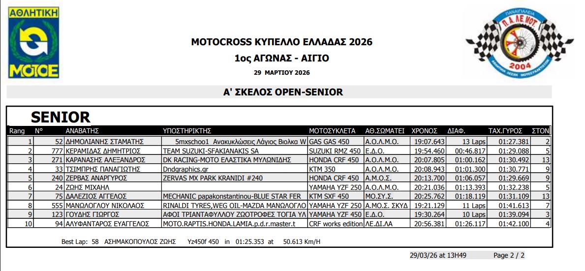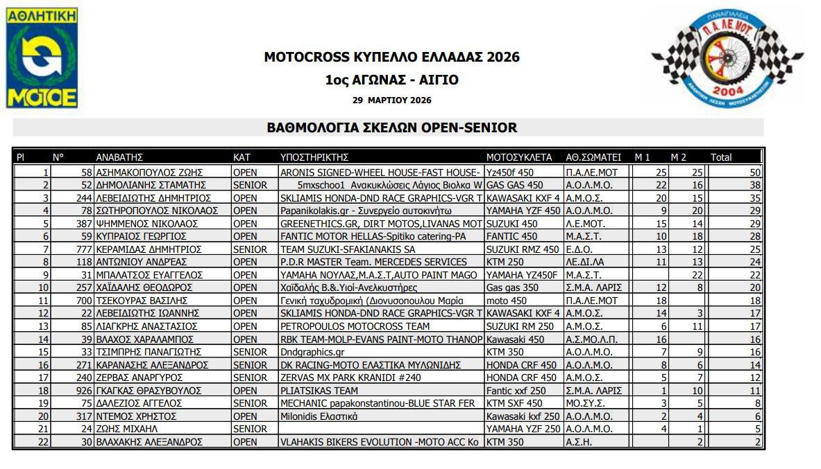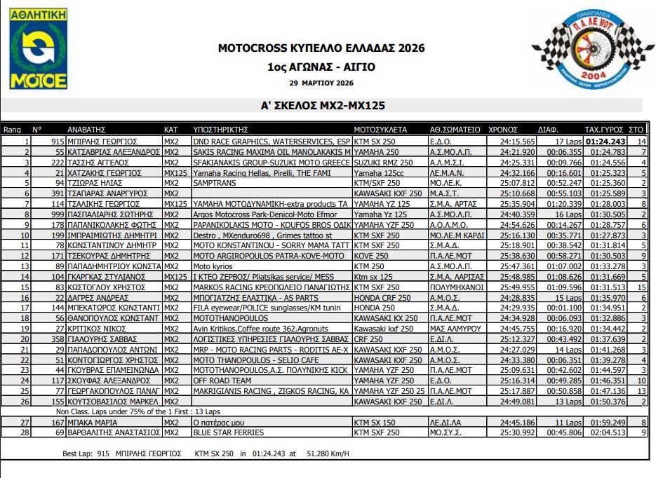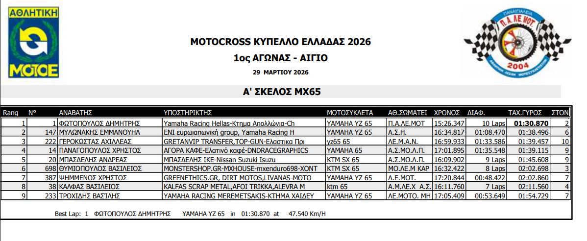 ΑΠΟΤΕΛΕΣΜΑΤΑ ΠΡΩΤΟΥ ΑΓΩΝΑ ΚΥΠΕΛΛΟΥ ΕΛΛΑΔΟΣ MOTOCROSS 2026 ΑΙΓΙΟ