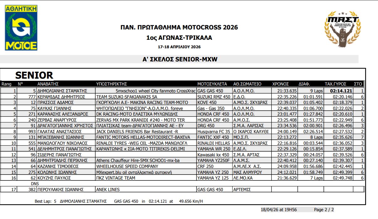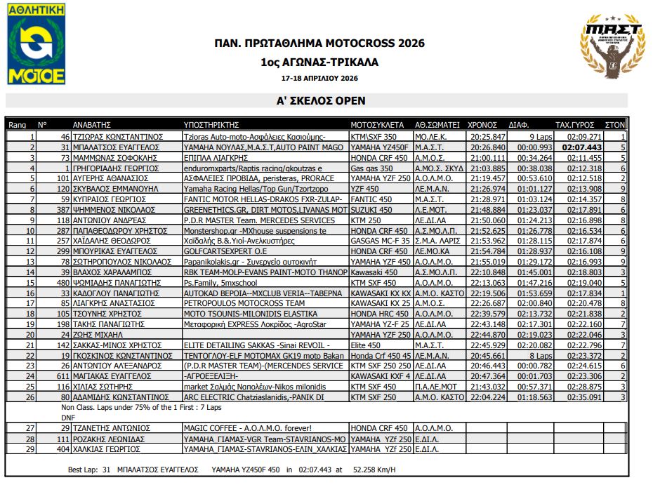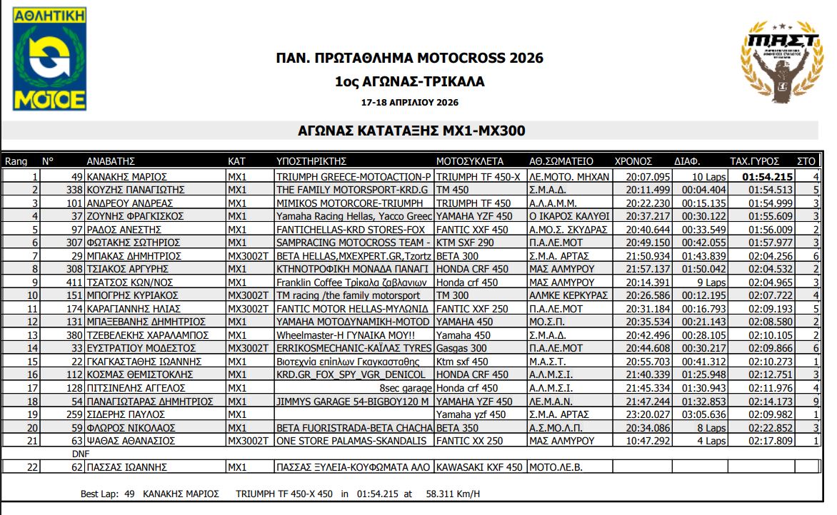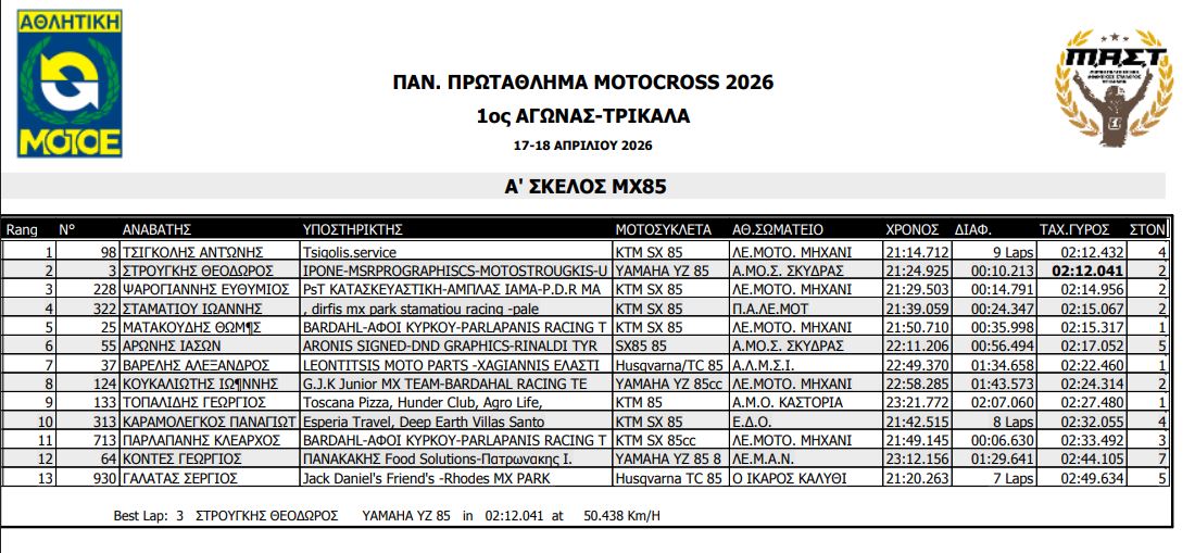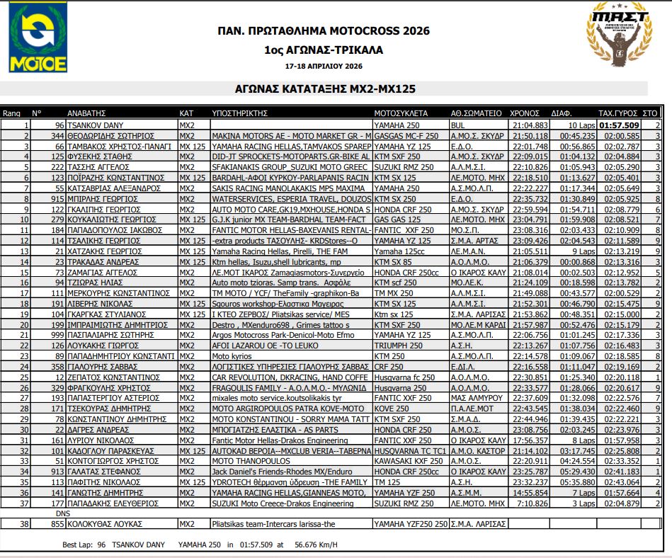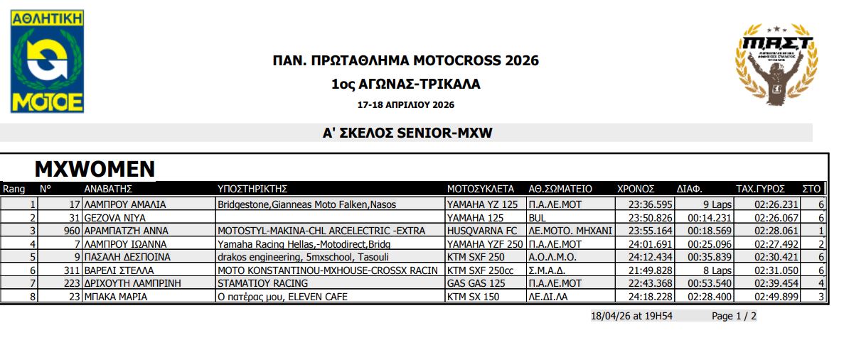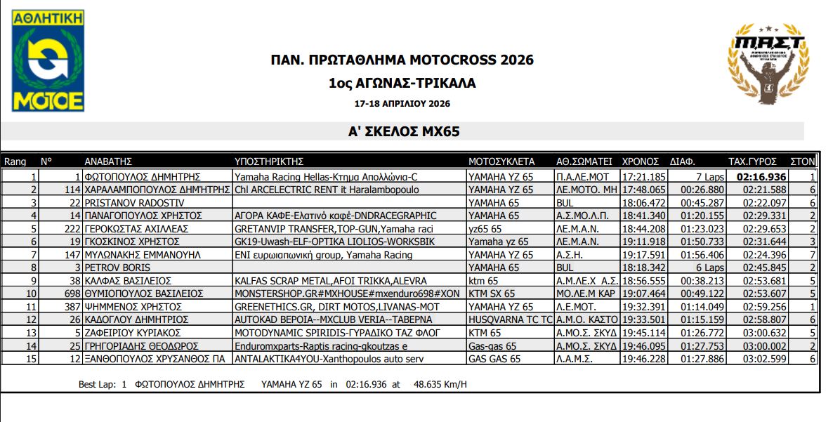 ΑΠΟΤΕΛΕΣΜΑΤΑ ΣΑΒΒΑΤΟΥ ΠΑΝΕΛΛΗΝΙΟΥ ΠΡΩΤΑΘΛΗΜΑΤΟΣ MOTOCROSS 2026 ΤΡΙΚΑΛΑ